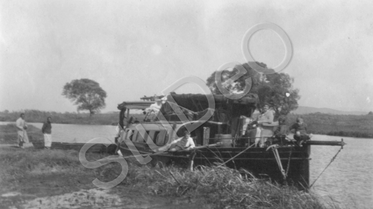 Beschreibung: Ferienfahrt auf dem Kaiserkanal mit Hausboot, angelegt im Taku-Lake. Ehepaar Gerngroß ist auf Jagt, die Kinder bleiben auf dem Hausboot.