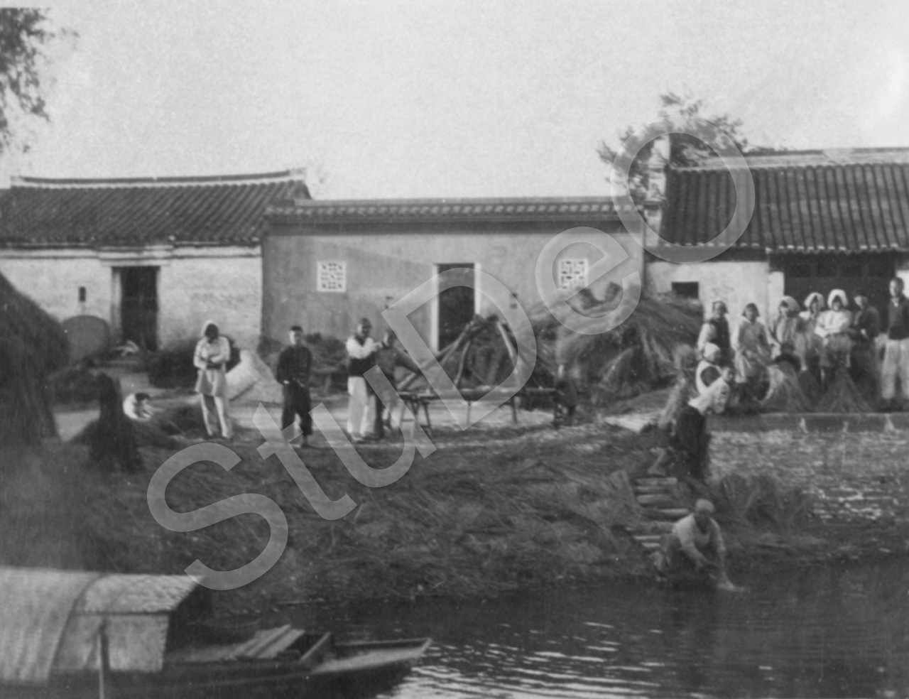 Beschreibung: Mit dem Hausboot (P0602) im Kaiserkanal an einem Dorf vorbeifahrend. Neugierige Chinesen. Frau wäscht Wäsche im Kanal.