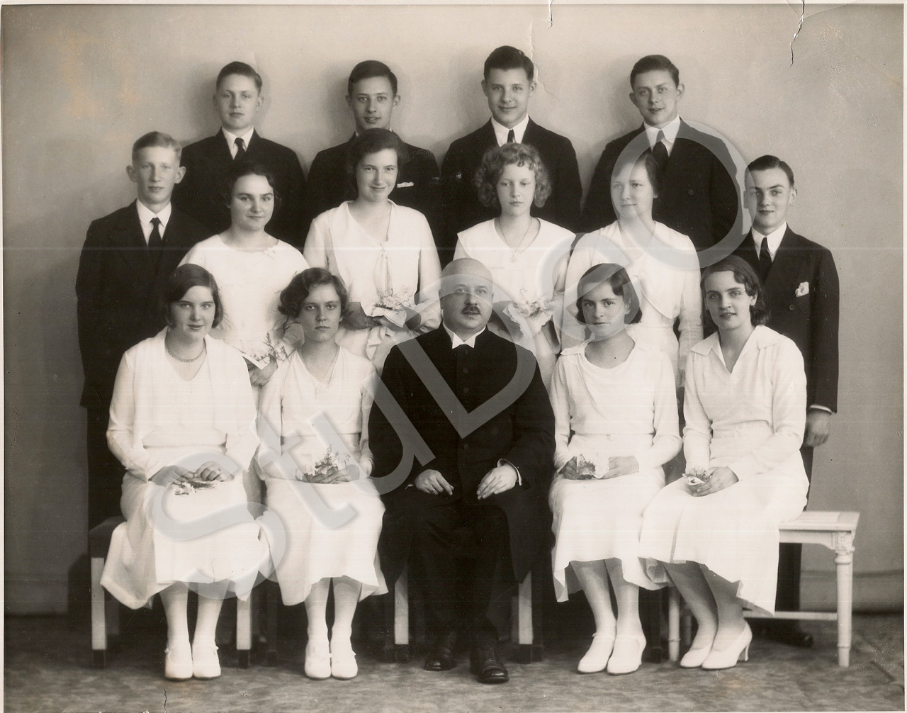 Beschreibung: Konfirmation mit Pastor Krüger. Konfirmanden: Irene Riik, Ursel Thiel, Christian und Heinz Eickhoff, und andere.