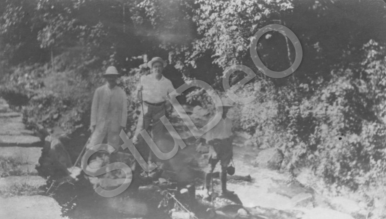 Beschreibung: 3 Herren in einer  Gegend mit üppiger Wegetation  in Mo­kan­schan.