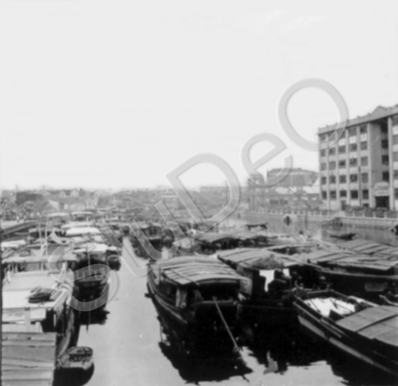 Beschreibung: Zahlreiche Wohnschiffe in einem Kanal.
