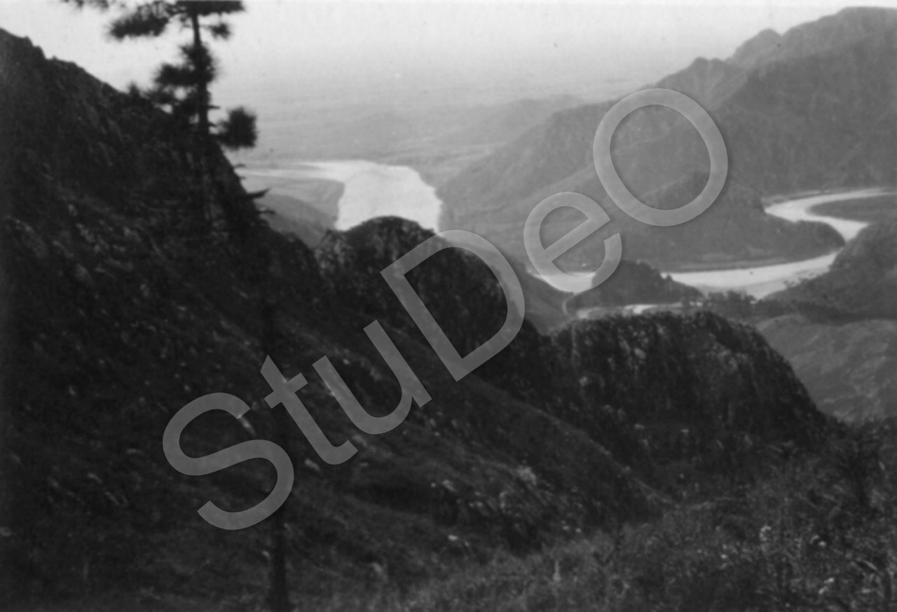 Beschreibung: Fluß zwischen kahlen, steinigen Bergen.