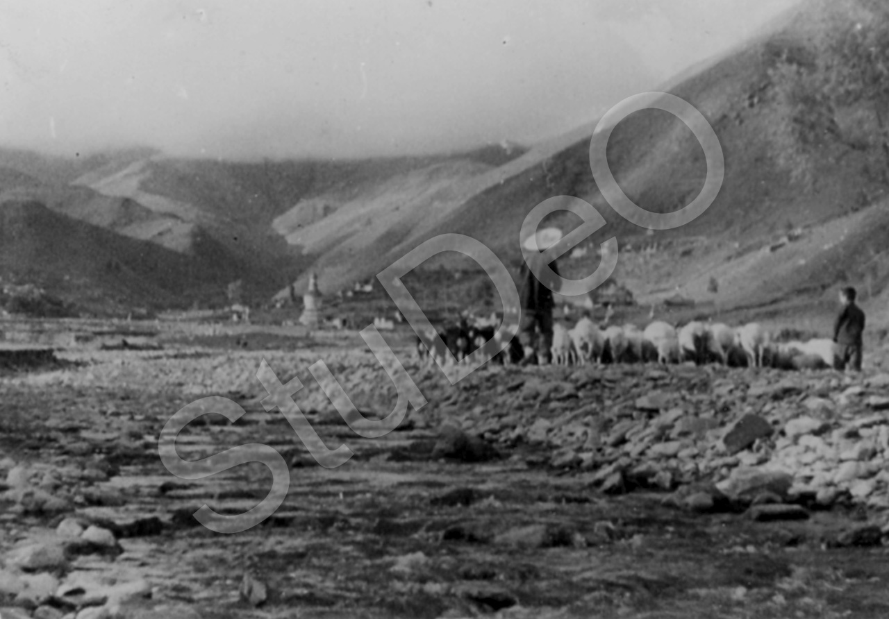 Beschreibung: Wutaishan, ein Bergmassiv mit 250 km Umfang im Nordosten der Provinz Shansi/Shanxi. Eine Schafherde in einem breiten Tal. Im Hitergrund eine weisse Pagode und evtl. Tempelanlagen.