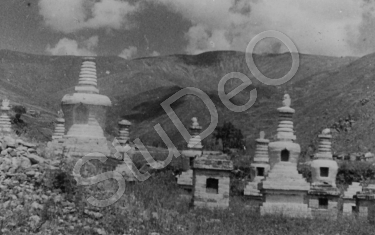 Beschreibung: Stupas (Gräber, Dagobas) auf einer Wiese am Wutaishan, ein Bergmassiv mit 250 km Umfang im Nordosten der Provinz Shansi/Shanxi?