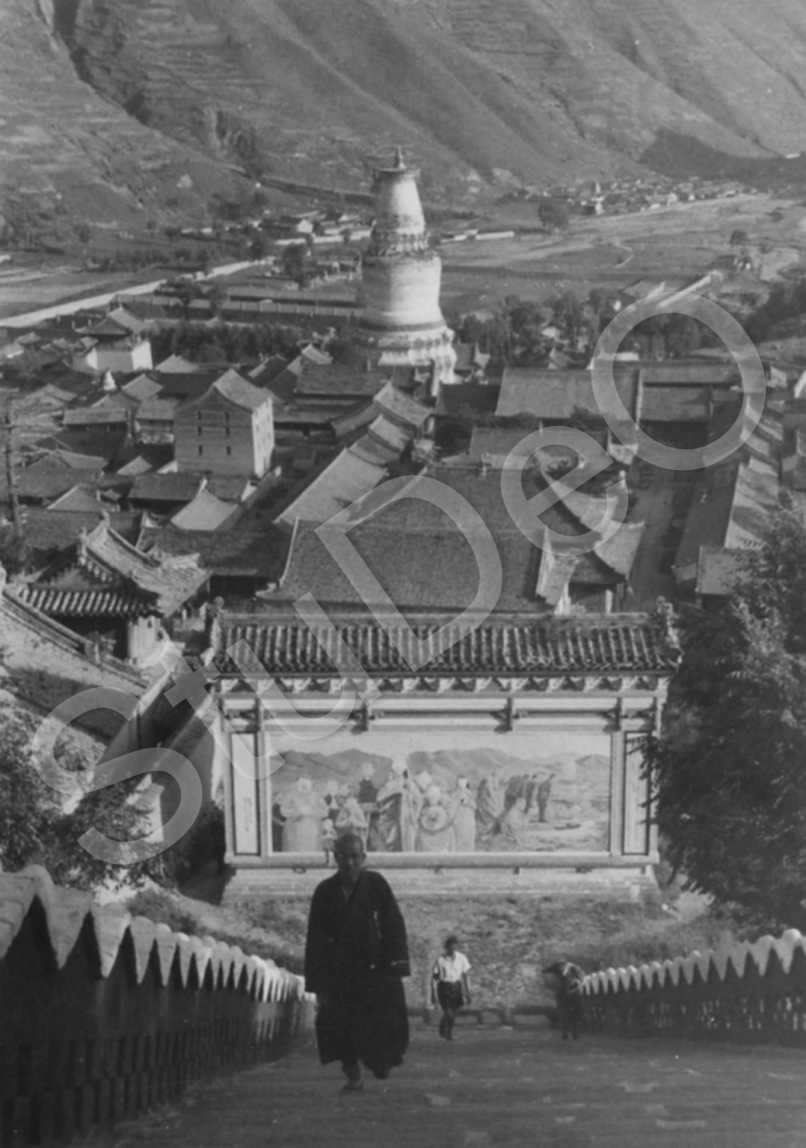 Beschreibung: Klosterstadt Taihua im breites Tal im Wutaishan, ein Bergmassiv mit 250 km Umfang im Nordosten der Provinz Shansi/Shanxi.. Tempel, weiße Pagode, Pavillon, Geisterwand, etc. Steile Treppe zu einem Tempel.