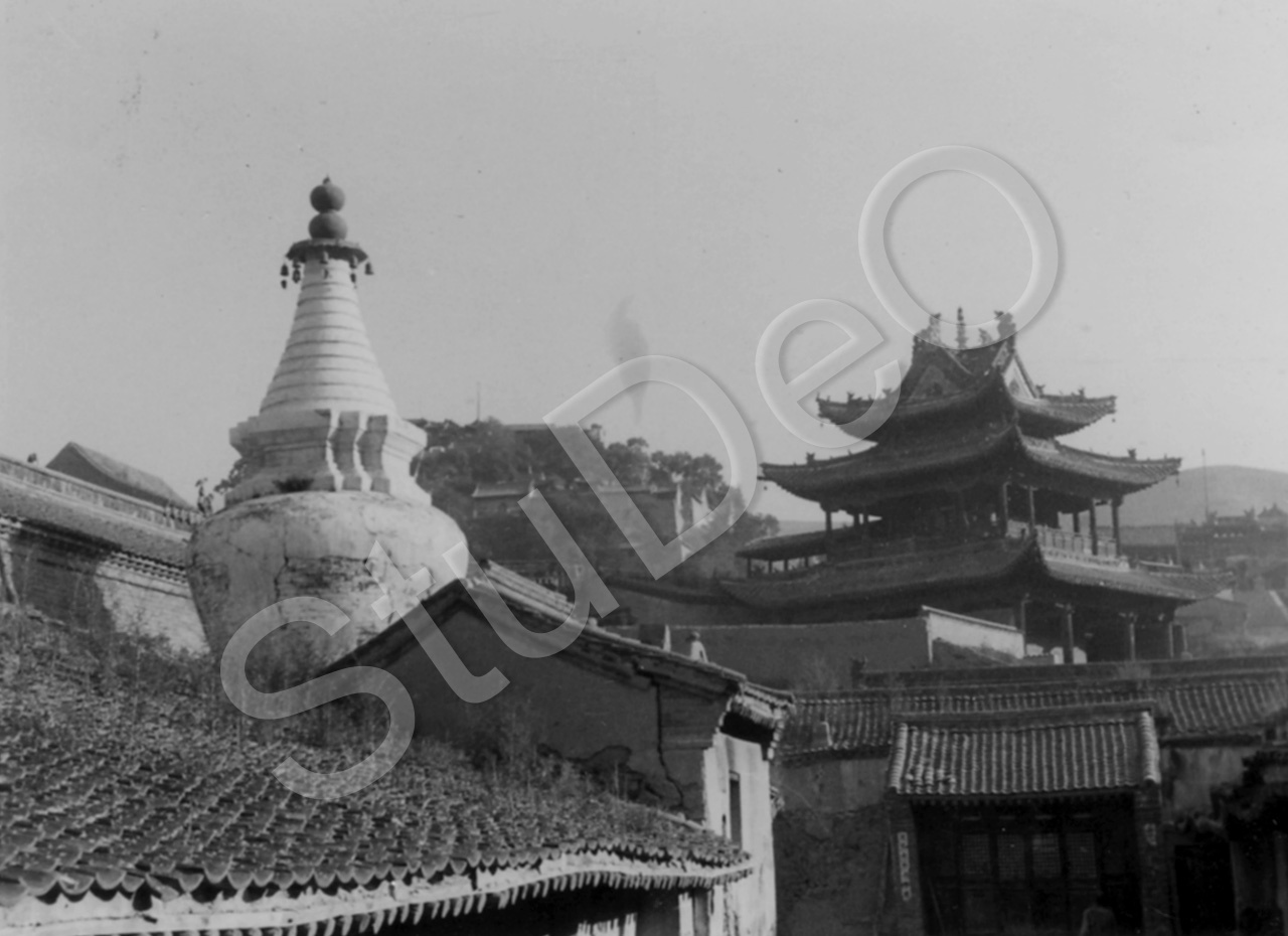 Beschreibung: Weiße Pagode und Tempelanlagen in Nahaufnahme vermutlich der Klosterstadt Taihua im Wutaishan, ein Bergmassiv mit 250 km Umfang im Nordosten der Provinz Shansi/Shanxi.