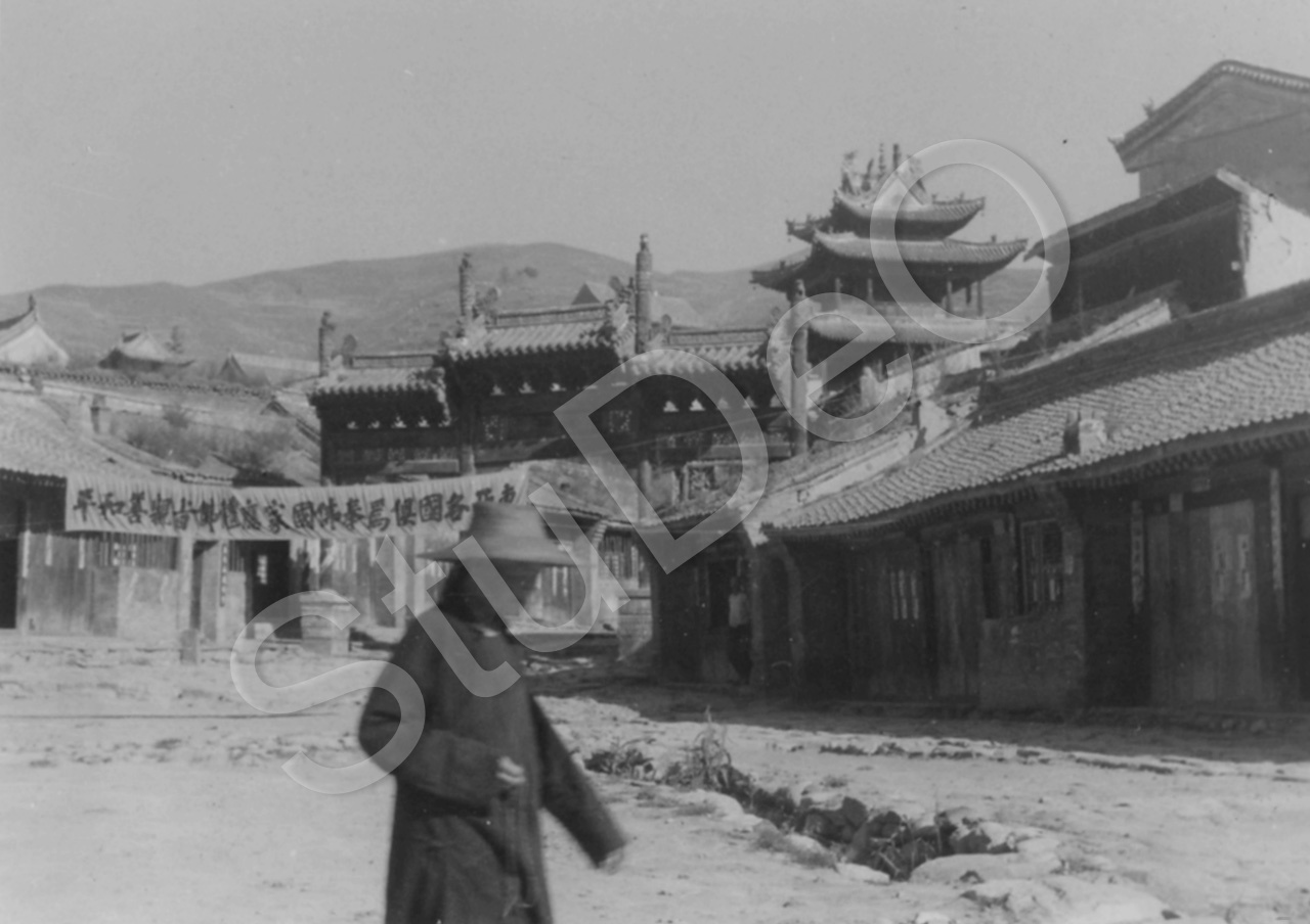 Beschreibung: Straße oder Platz der Klosterstadt Taihua im Wutaishan, ein Bergmassiv mit 250 km Umfang im Nordosten der Provinz Shansi/Shanxi. Tempelanlage um einem Platz in Nahaufnahme.