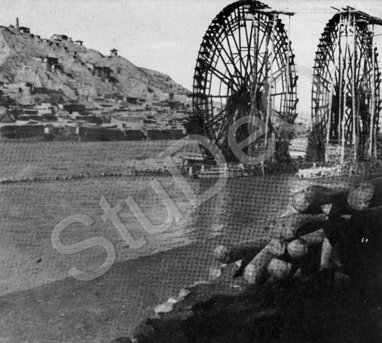 Beschreibung: „Wasserschöpfräder im Gelben Fluss, Hoang Ho, bei Lanchow“, (neu: Lanzhou), in der Provinz  Gonsu, westlich von Shaansi/Shaanxi.