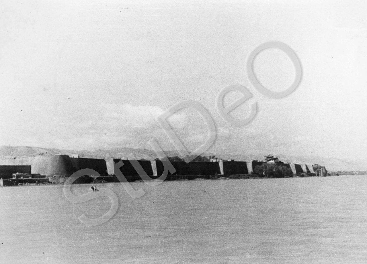 Beschreibung: Festungsmauer am Flussufer, vermutlich in Ninchia bzw. Ninxia.