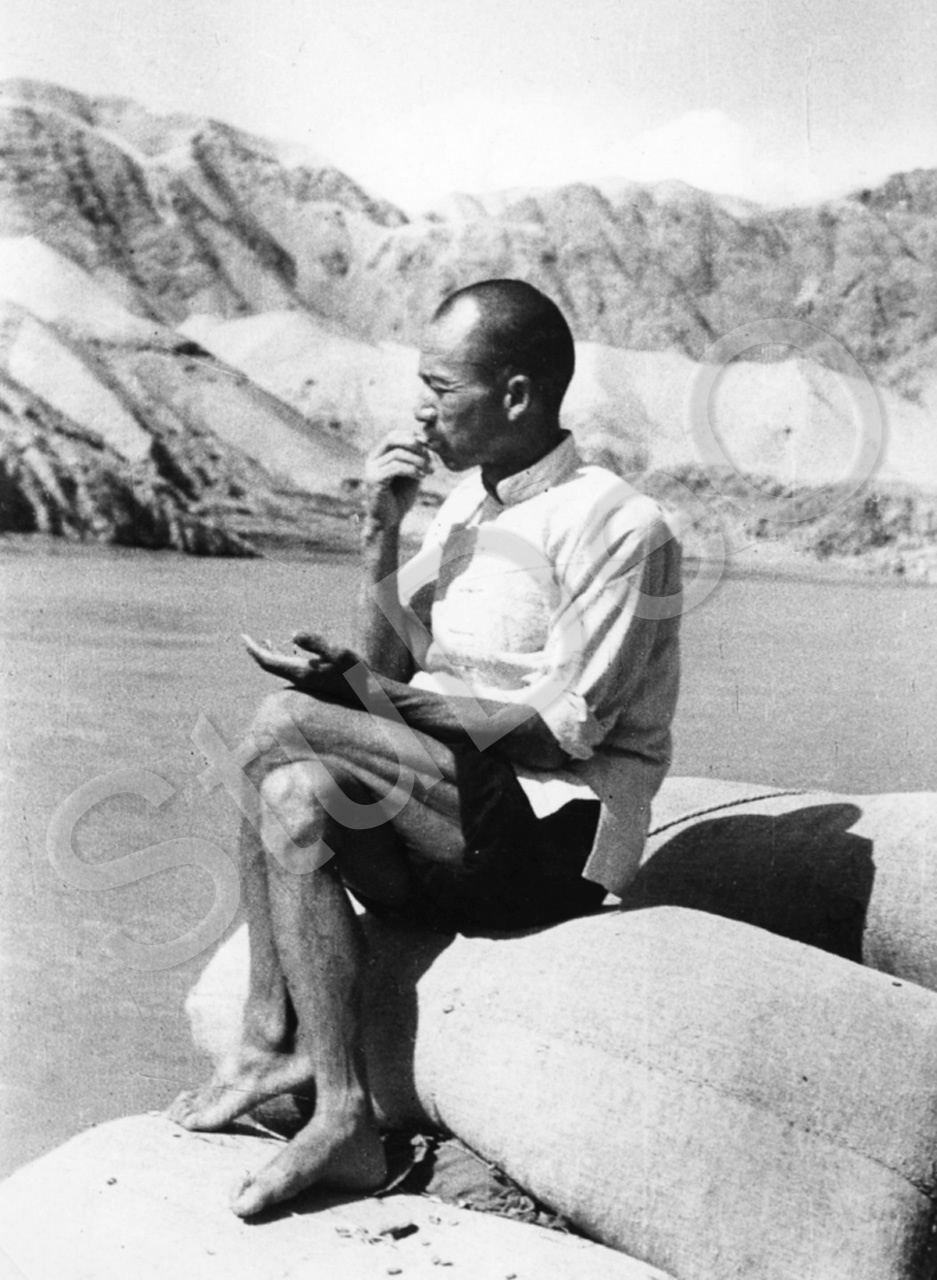 Beschreibung: Ein Chinese sitzt auf den mit Säcken beladenen pi-fatste-Boot. Auf dem Gelben Fluss, Hoang Ho.