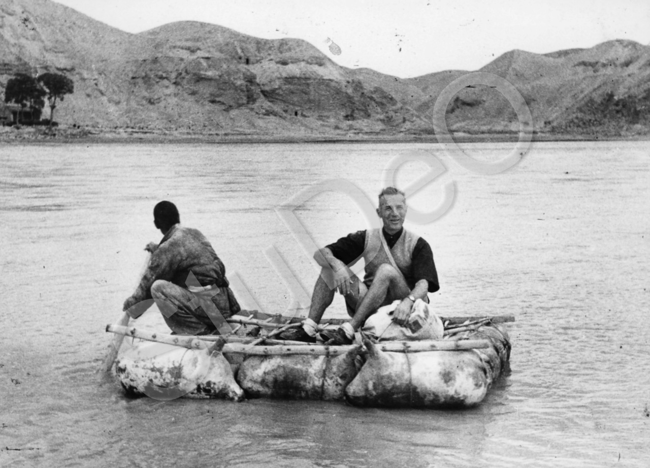 Beschreibung: Prof. Günther Huwer setzt seine Fahrt mit einem kleinen pi-fatste-Floß weiter, nachdem der Führer des größeren Bootes die Weiterfahrt verweigerte. Auf dem Gelben Fluss, Hoang Ho.