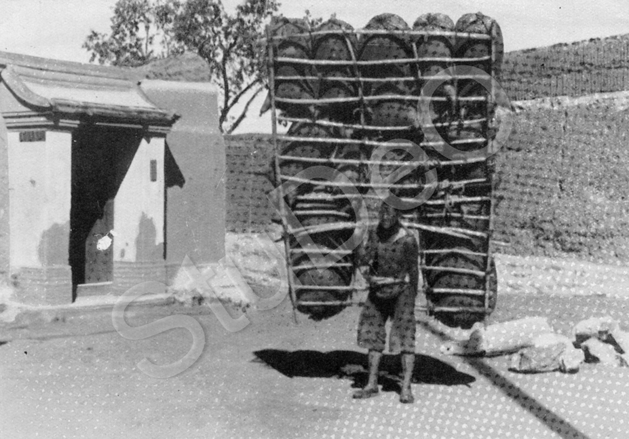 Beschreibung: „Ziegenfellboot aus Lanchow“ (neu: Lanzhou), in der Provinz  Gonsu, west­lich von Shaansi/Shaanxi. Es werden dafür auch Rinderhäute verwen­det. Der Chinese nimmt Gäste auf seinem Boot den Fluß abwärt mit und bringt das Floß zu Fuß wieder hoch.