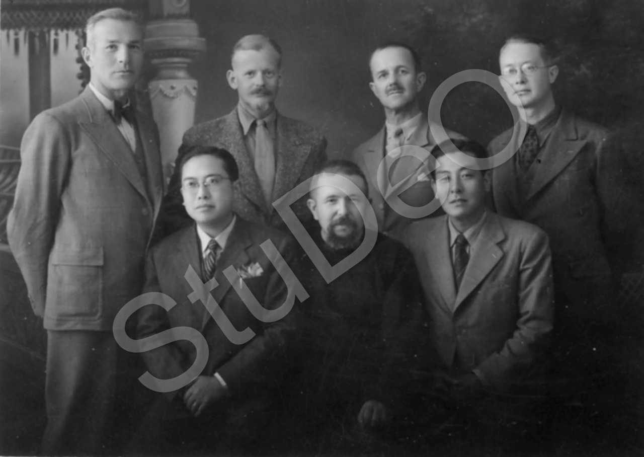 Beschreibung: „In Ningsia auf der Flucht, Prof . Günther Huwer, Hans Theuerkauf, A. v. Delwig, sitzend: 2 Chinesen und Pater Cornelius“. Provinz Ningsia = Nin­xia, die Hauptstadt Yinchuan liegt am Gelben Fluß.