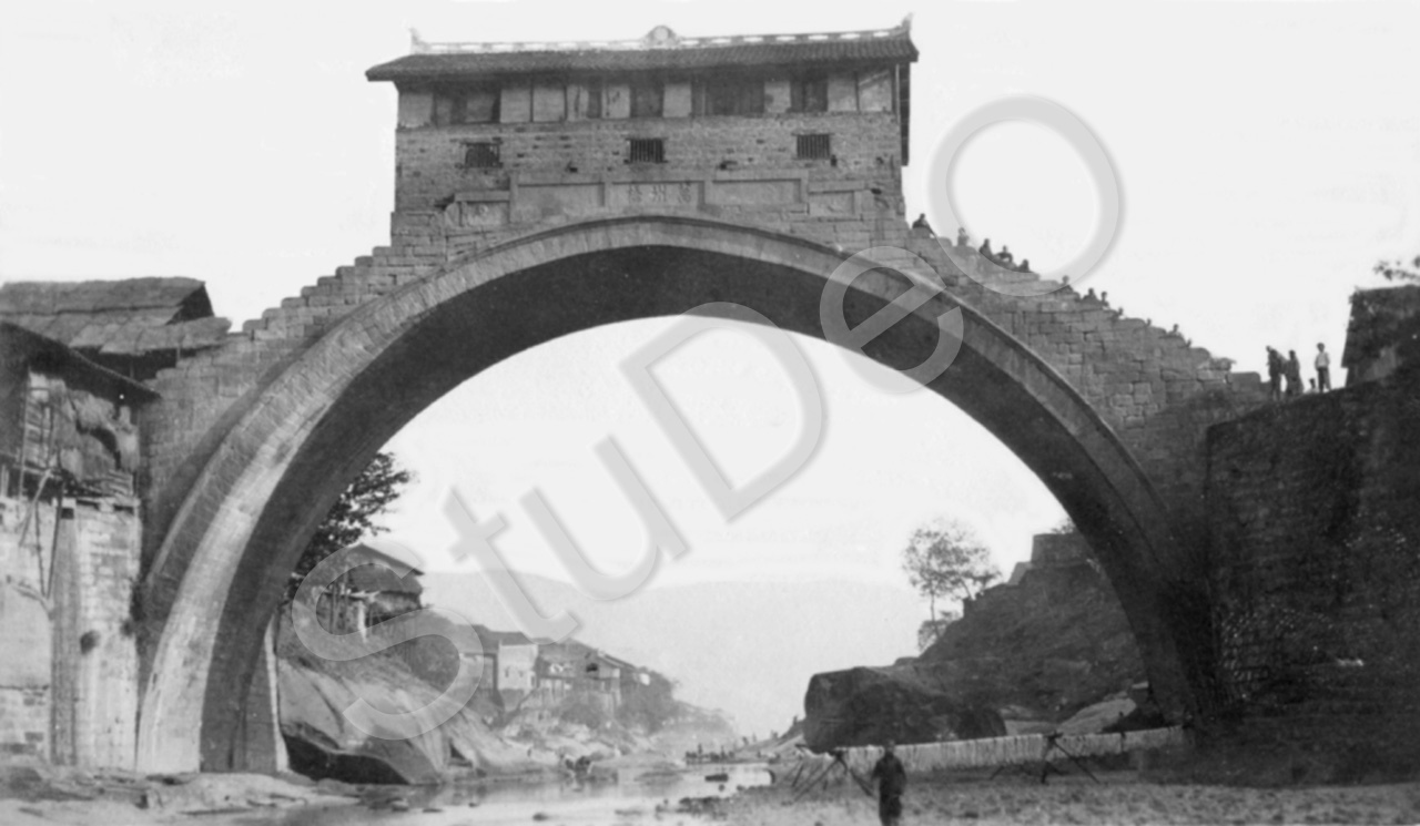 Beschreibung: Steinerne Bodenbrücke mit Haus drauf in Wanhsien.