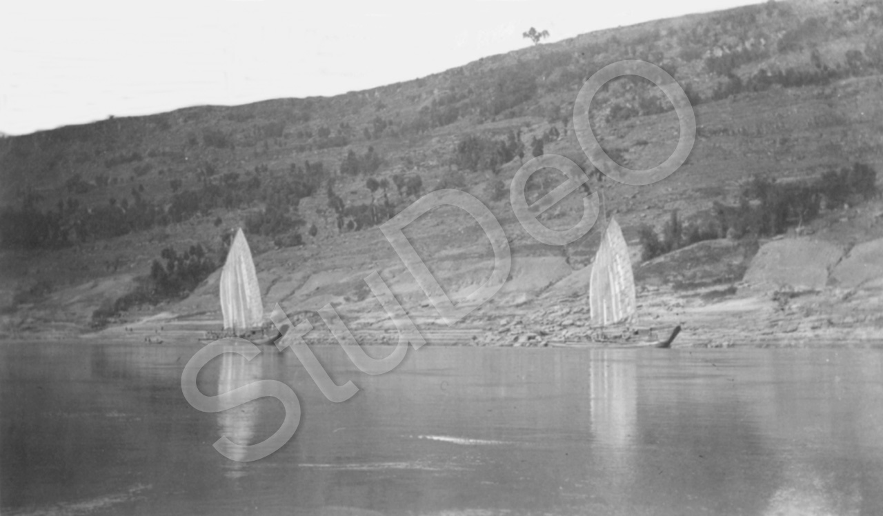 Beschreibung: Dschunken vor einem langsam ansteigendem Ufer zwischen Wanshien und Zhongxian.