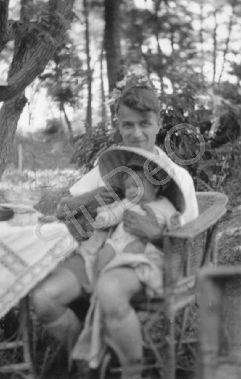 Beschreibung: Otto Günther mit dem ersten Sprössling Wolfgang im eigenen Garten.