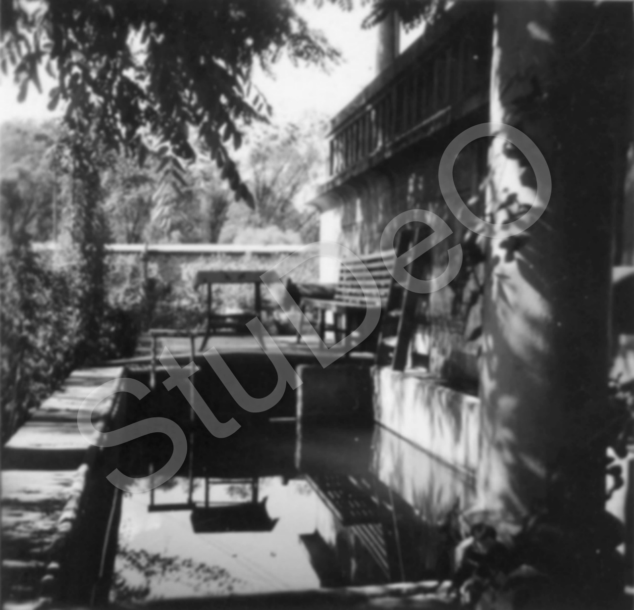 Beschreibung: Altes Schwimmbad am Pumpenhaus mit anschließendem Sitzplatz im Garten der Fam. Otto Günther. Die Mauer führt links zur Sonnenecke (z.B. P3077). Rechts hinter dem Pumpenhaus ist der Fluß Tu Ho.