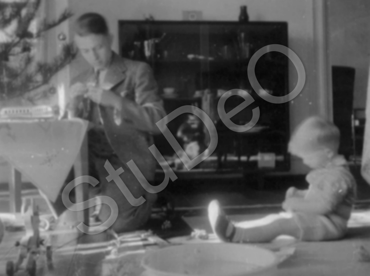 Beschreibung: „Heilig Abend. Papa spielt mit der Eisenbahn und Schnuckel lässt Enten im Waschbecken schwimmen“. Otto Günther u. Sohn Wolfgang im Esszimmer.