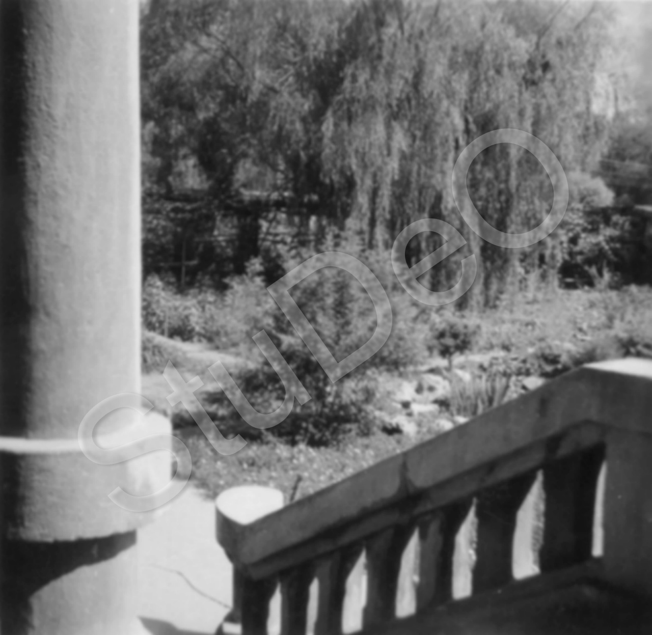 Beschreibung: Blick von der Hausveranda in einen Gartenteil in Richtung der Bedien­steten-Häuser bei Fam. Otto Günther.