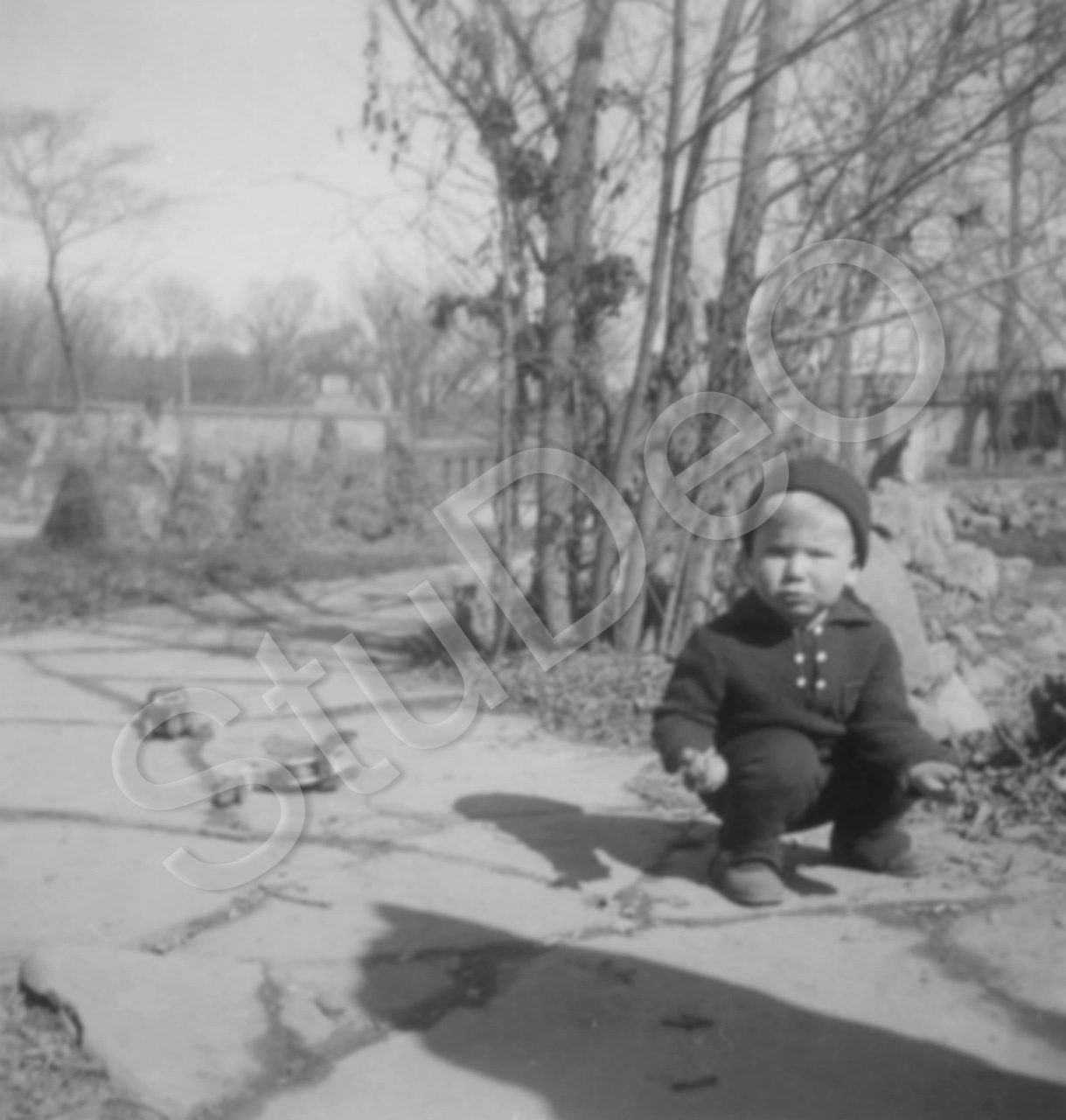 Beschreibung: Wolfgang Günther im Garten „Ja dau la! Die Ente ist wieder umge­fallen“. Hinten links die Mauer zur Straße, rechts das Pumpenhaus.
