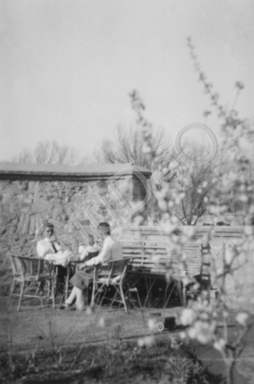 Beschreibung: Beliebte Sitzecke im Garten der Fam. Otto Günther, zu Besuch E. Schild aus Shanghai. Hinter der linken Mauer ist die Straße u. der rechten Mauer der Tu-Ho Fluß.