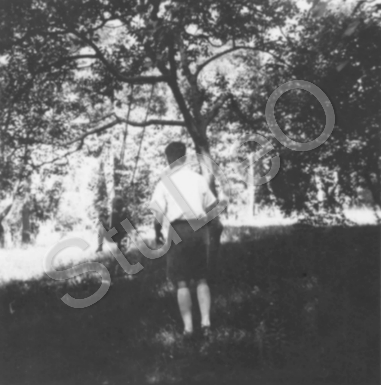Beschreibung: „Otto Günther schaukelt seinen Sohn Wolfgang unter dem Aprikosen­baum im Garten“.