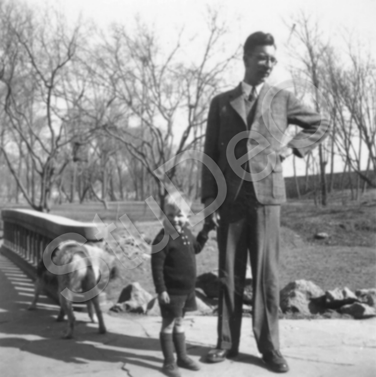 Beschreibung: „Der lange Niveaonkel (E. Schild) mit dem kleinen Wolfgang (Günther)“ Im Garten von Günthers. Rechts der Teich gerade leer, hinten links der Fluß Tu Ho und rechts die Grenzmauer nach hinten. Nicht weit von der Grenzmauer führt die Tientsin-Schanhaiguan Bahn vorbei.