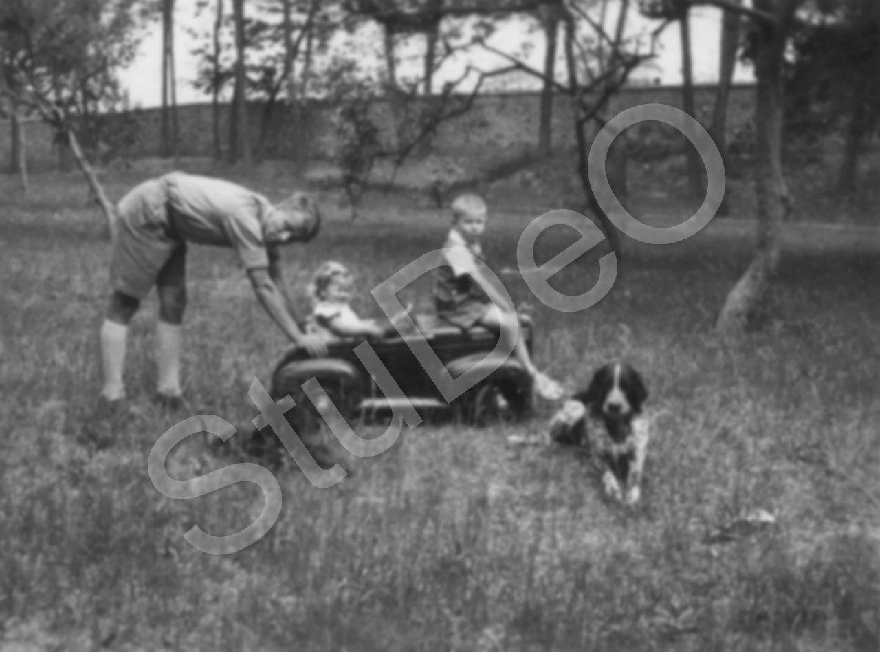 Beschreibung: Otto Günther schiebt Spielauto mit Anita und Wolfgang im Garten. Die Grenzmauer vom Gaten nach hinten, in Richtung der Bahnlinie.