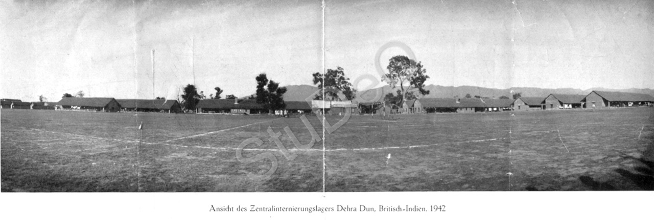 Beschreibung: „Ansicht des Zentralinternierungslagers Dehra Dun in Britisch-Indien“ Gelände mit den Baracken.