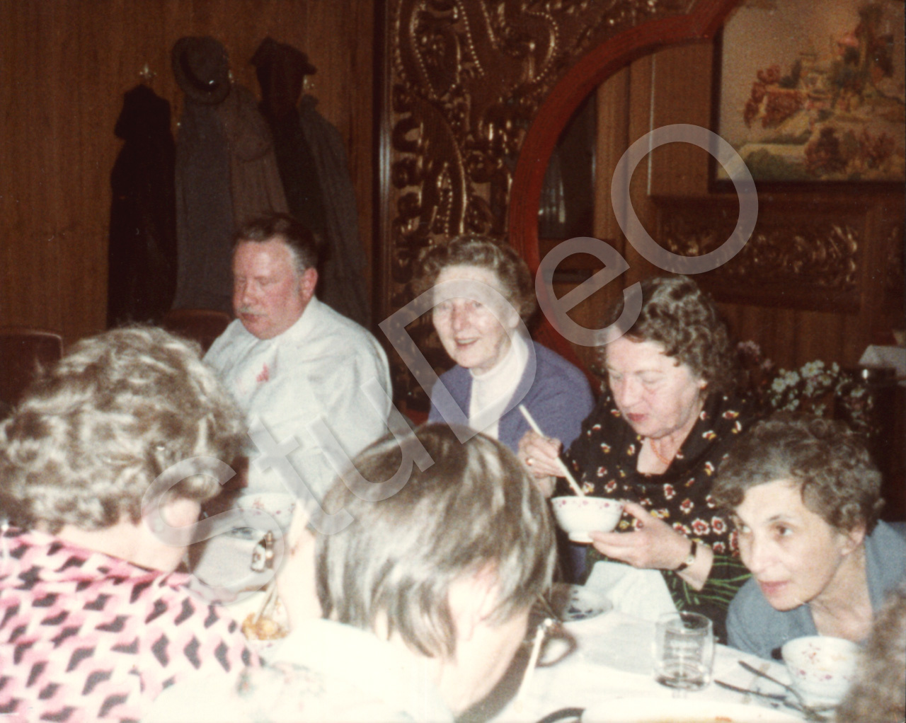 Beschreibung: Albert Wetzel, Olga Kleemann, Agnes Malin, Hilde Neumann und andere treffen sich beim Chinesichessen in Bremen. Organisiert von Gretel Krüer (Rücken links).