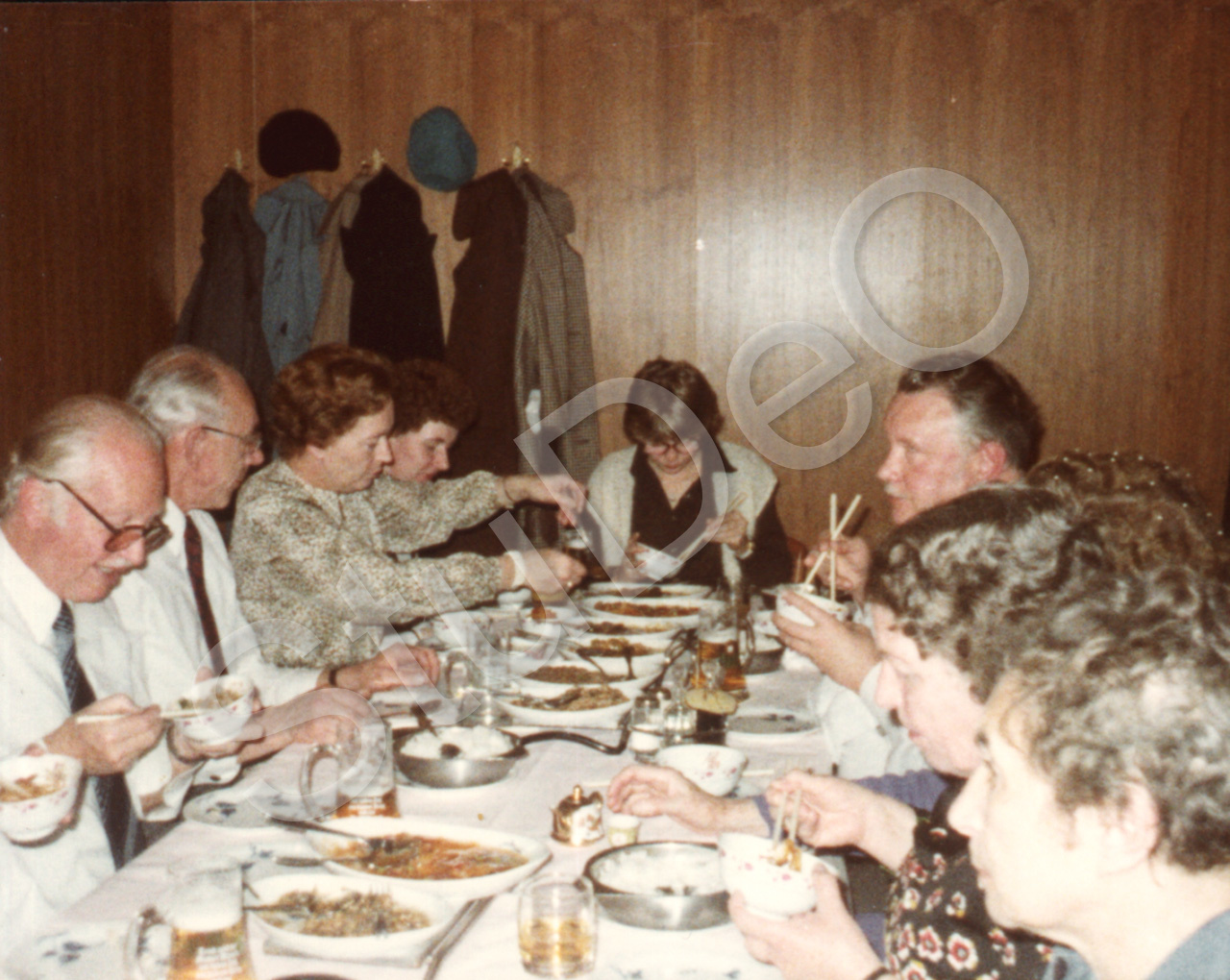 Beschreibung: r.v.hinten: Albert Wetzel, Agnes Malin, Hilde Neumann. Links ? treffen sich beim Chinesischessen in Bremen.