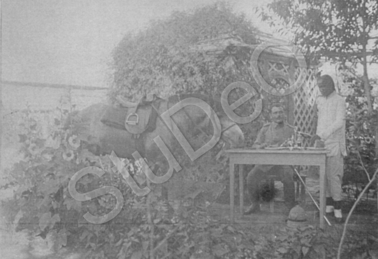 Beschreibung: Pferd „Jop“, Paul Kriegel und Boy Wang Su vor dem Ausritt, beim Essen.
