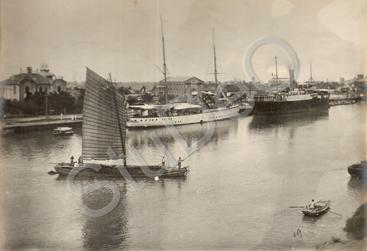 Beschreibung: Dampfer im Peiho liegen an. Vom Wasser aus gesehen.