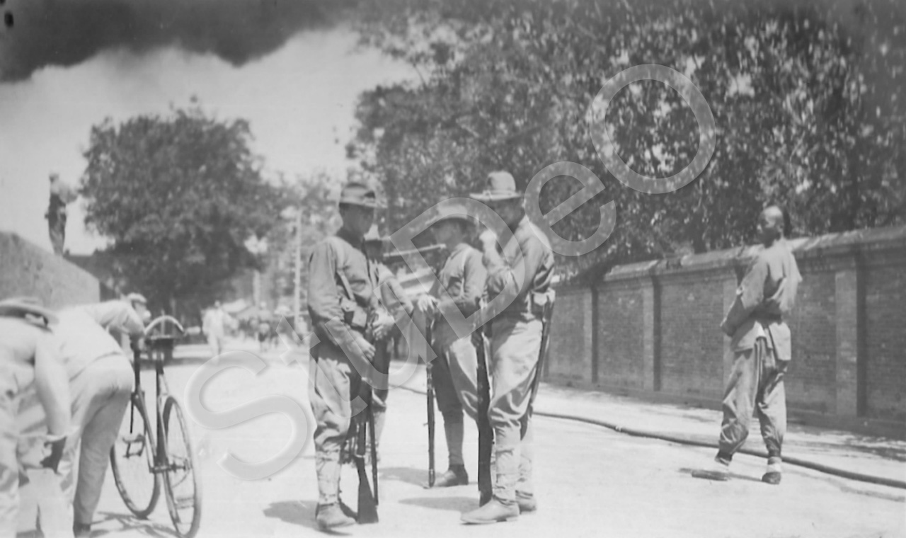 Beschreibung: Rauchwolken, vermutlich durch Plünderer gegen. Amerikani­sche Soldaten stehen sprechend auf der Straße.