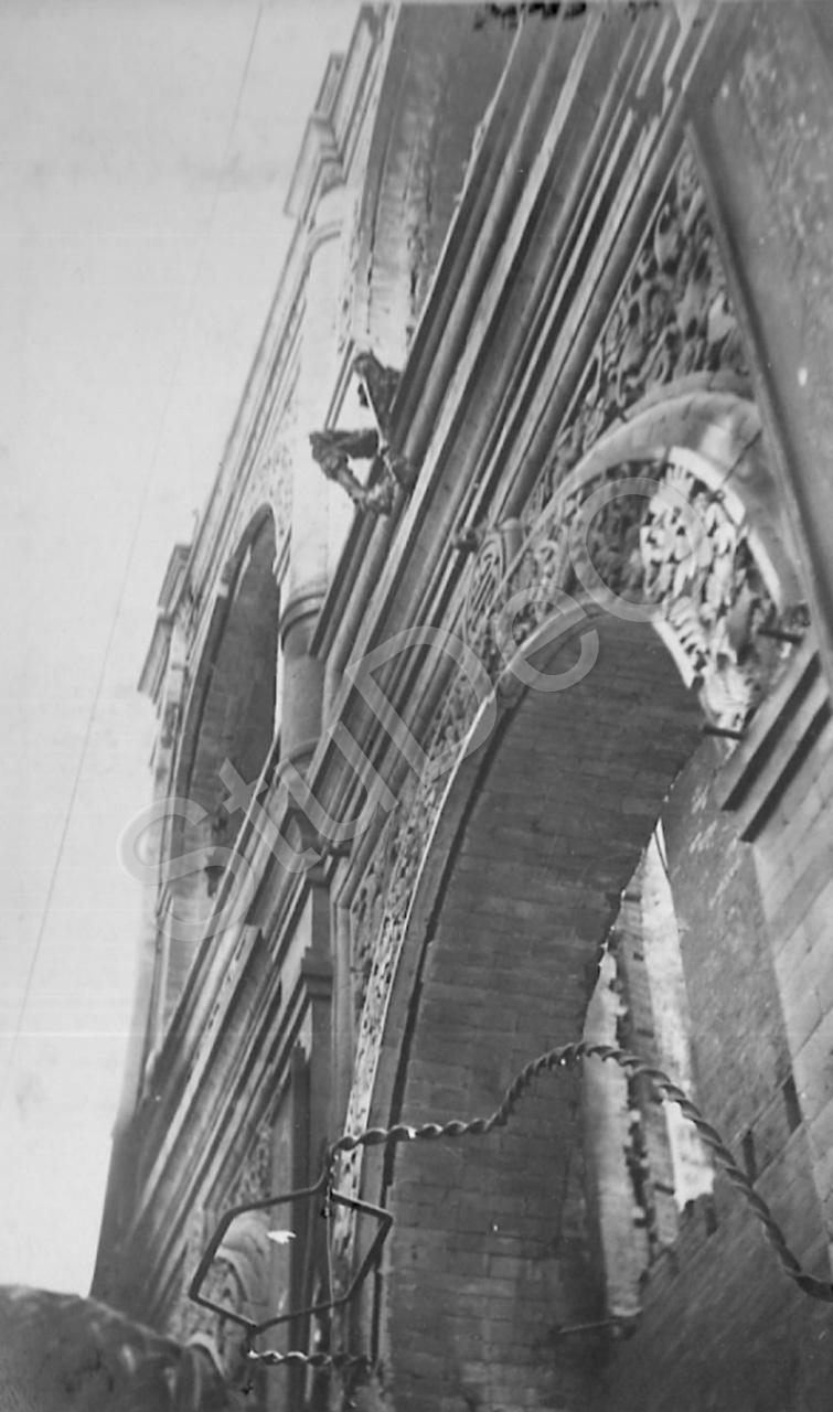 Beschreibung: Ein verbrannter Plünderer auf einem Sims eines in der Revolution verbranntes Haus.