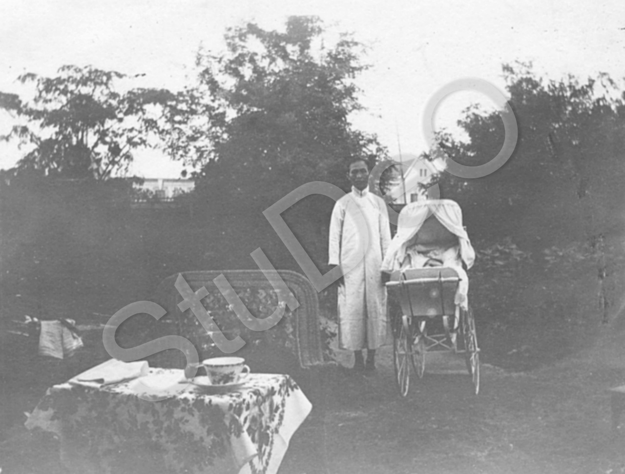 Beschreibung: Boy Chang von der Familie Balser mit Karl August Balser jr. im Wagen im Garten des Hauses in der Council Rd. 10.