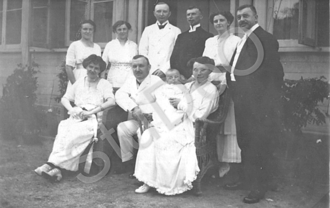 Beschreibung: Tauftag von Helmut Balser, auf dem Schoß der Mutter Marie Balser. Karl August Balser mit weißer Jacke stehend.