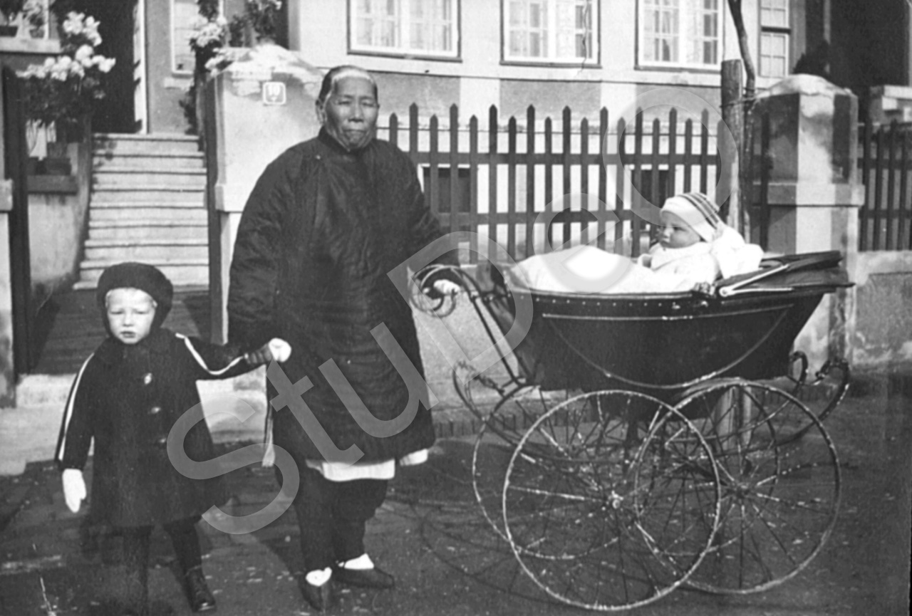 Beschreibung: Amah führt Karl August und Helmut (im Wagen)Balser aus. Vor Balsers Haus in der Council Rd. 10 im Winter.