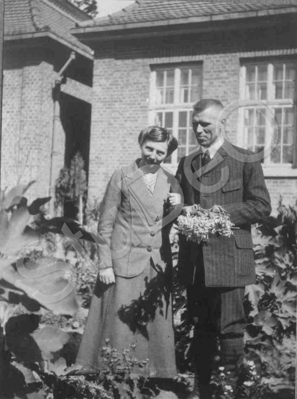 Beschreibung: Die Lehrer Frieda und Hans Jensen vor ihrem Wohnhaus im Schulge­bäu­de der Deutschen Schule.