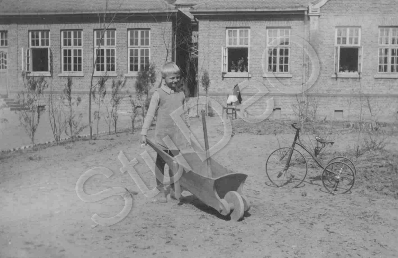 Beschreibung: Uwe Jensen spielt im Garten des Schulleiterhauses neben des Schulge­bäudes, das links von der noch kleinen Hecke anfängt.