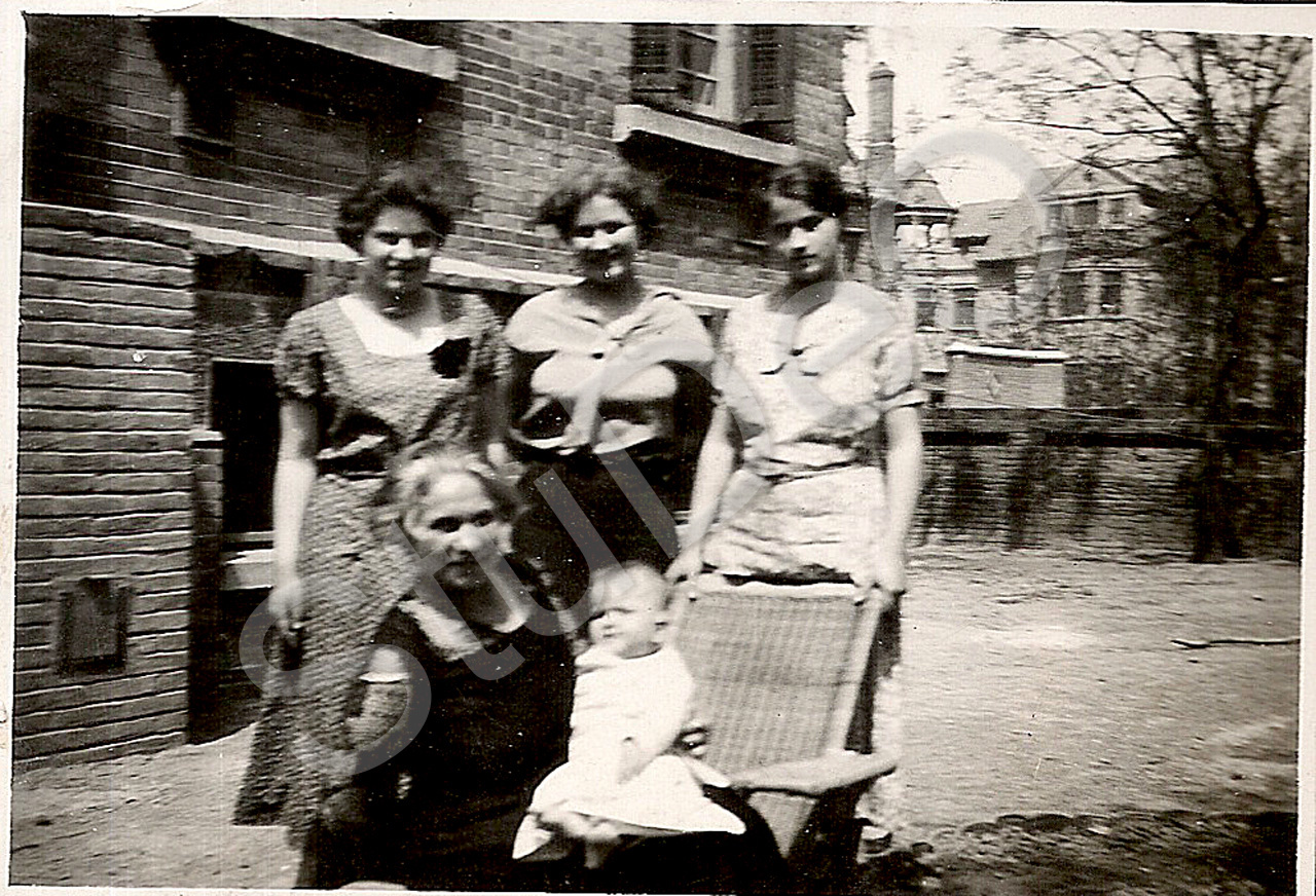 Beschreibung: 3 Generationen: Oma Ella Scholz mit Renate Puck auf dem Schoß, hinter Sessel Maria Puck geb. Scholz, li. daneben ihre Schwestern Gerda und Greta. Hinter dem Haus in der Hongkong Road.