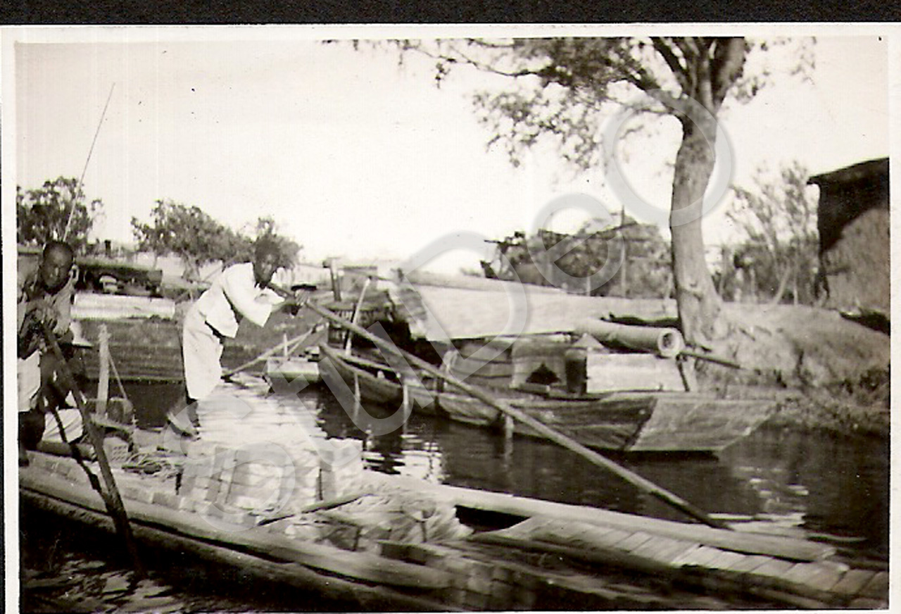 Beschreibung: Robert und Maria Puck (nicht im Bild) auf einer Bootsfahr auf den Kanälen am Race Course in Tientsin, Chinesen transportieren Waren auf Stocherkähnen.