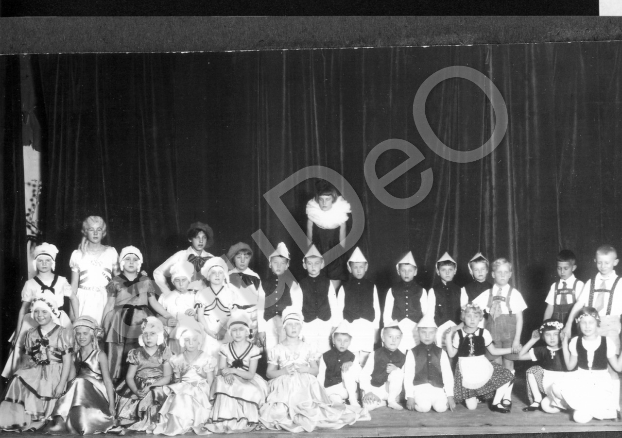 Beschreibung: Schüler führen ein Schauspiel auf. Mitwirkende: Ursula Lange, Ada Meier, Bar­bara Geyling, Felicitas Rumpf, Thirza Skoff, Friedel Bader (o. Christel Bader), Barbara Sixt, Gisela Jannings, Reimund Skoff, Mischa Oberrenner, Thies Jensen, u.a.