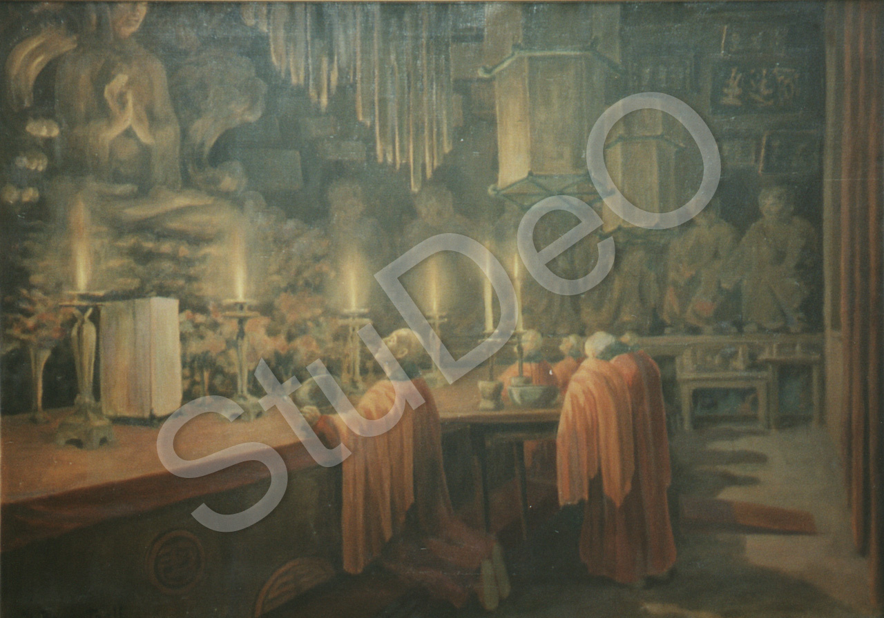 Beschreibung: Chinesische Mönche beten in einem mit Kerzen beleuchteten Tempel. Gemalt auf Leinwand von Bryantzeff in Tientsin 1936.