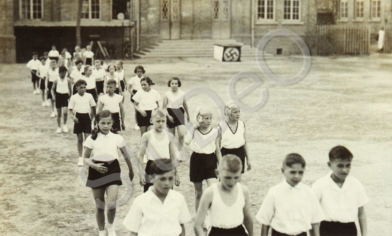 Beschreibung: Kinder der Quinta? und anderen Klassen? marschieren in Turnanzug im Schulhof der Dt. Schule. Dritte Reihe 3.v.l. Sophie Ibrangimoff.