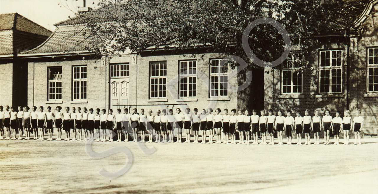 Beschreibung: Kinder verschiedener Klassen stehen aneinandergereiht im Schulhof der Dt. Schule vor der Pappel.