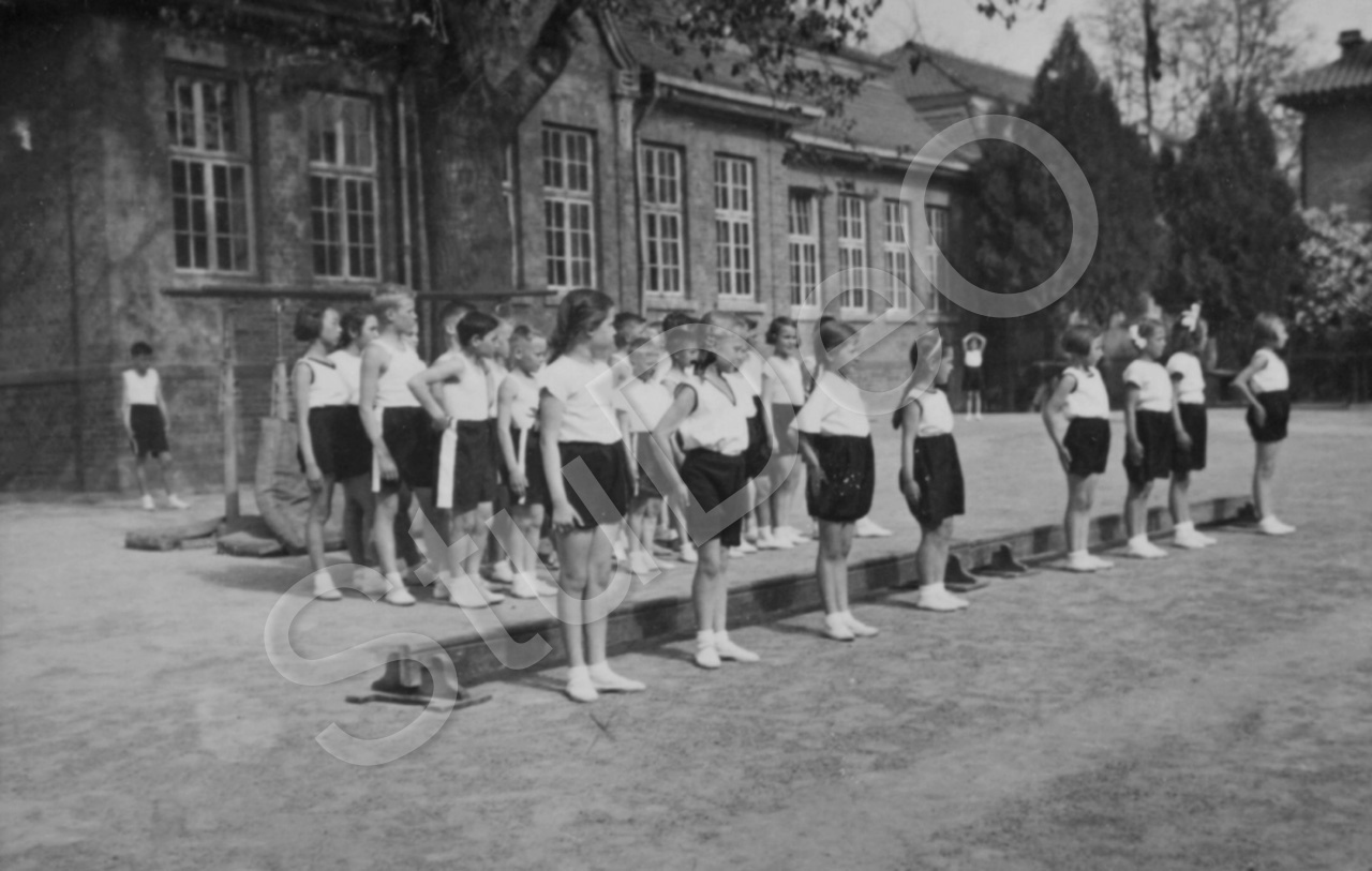 Beschreibung: Vorführungen am Schwebebalken vor dem Hauptgebäude der Deutschen Schule Tientsin am 01.05.1937.