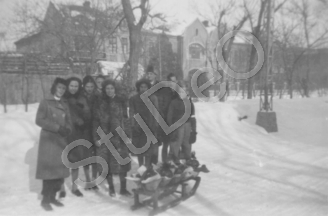 Beschreibung: Pastor Wolfgang Müller mit Schülern in Schneelandschaft am 23.12.1938: v.l. Tita Rumpf, Claudia Brann, Gisela Lange, Thieza Skpff (hinten), Mausi Geyling, Lore nimz,, Harry Poulsen (hinten), davor Hans Wittig.