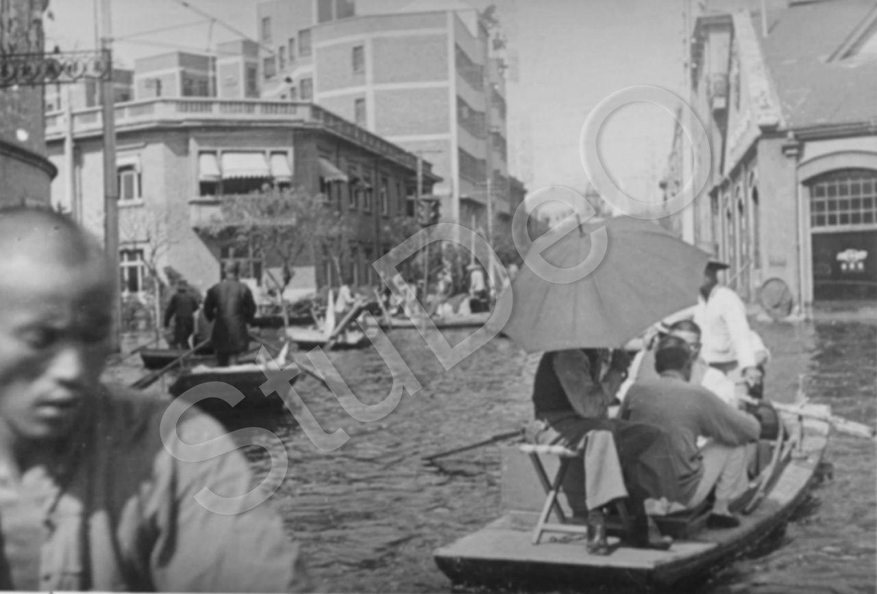 Beschreibung: Boote als Transportmittel auf den überfluteten Straßen. Straßenkreuzung.