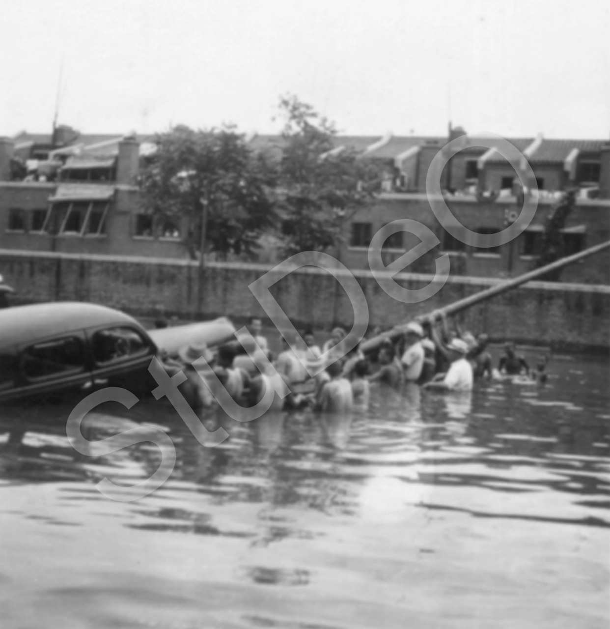 Beschreibung: Europäer und Chinesen versuchen ein Auto mit einer langen Stange aus den Fluten zu holen.